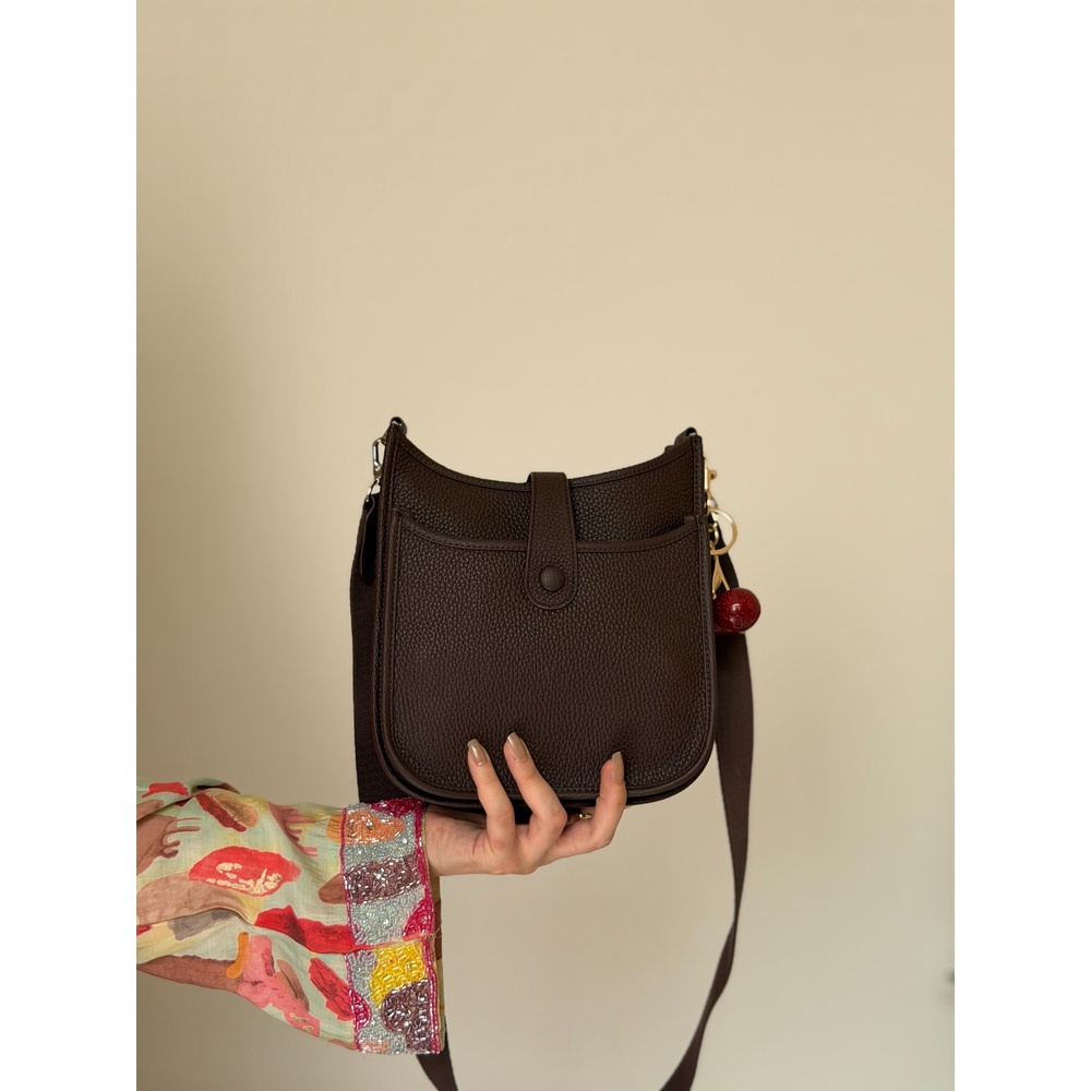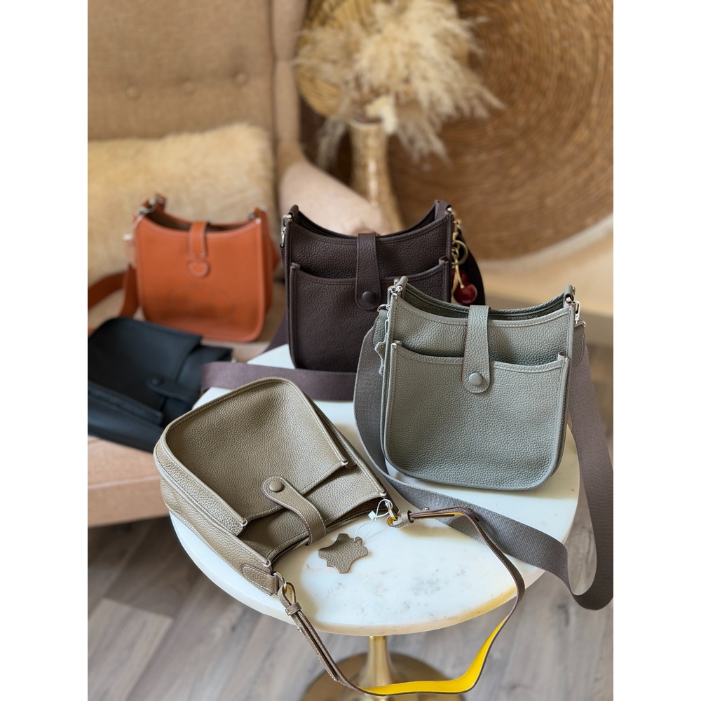 الوصف التفصيلي: Made from premium pebbled leather with a soft touch, this crossbody keeps your essentials organized without feeling bulky. It features an easy top‑zip opening, a neat interior with pockets for quick access, and a front slip pocket secured by a snap tab—perfect for items you reach for often. The wide strap is fully adjustable, so you can wear it crossbody or on the shoulder with a stable, comfortable fit. Finished in versatile earthy tones that match effortlessly with daily outfits.