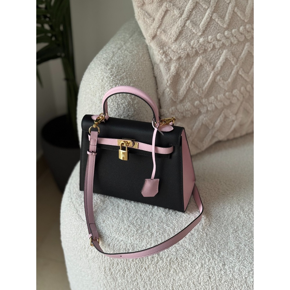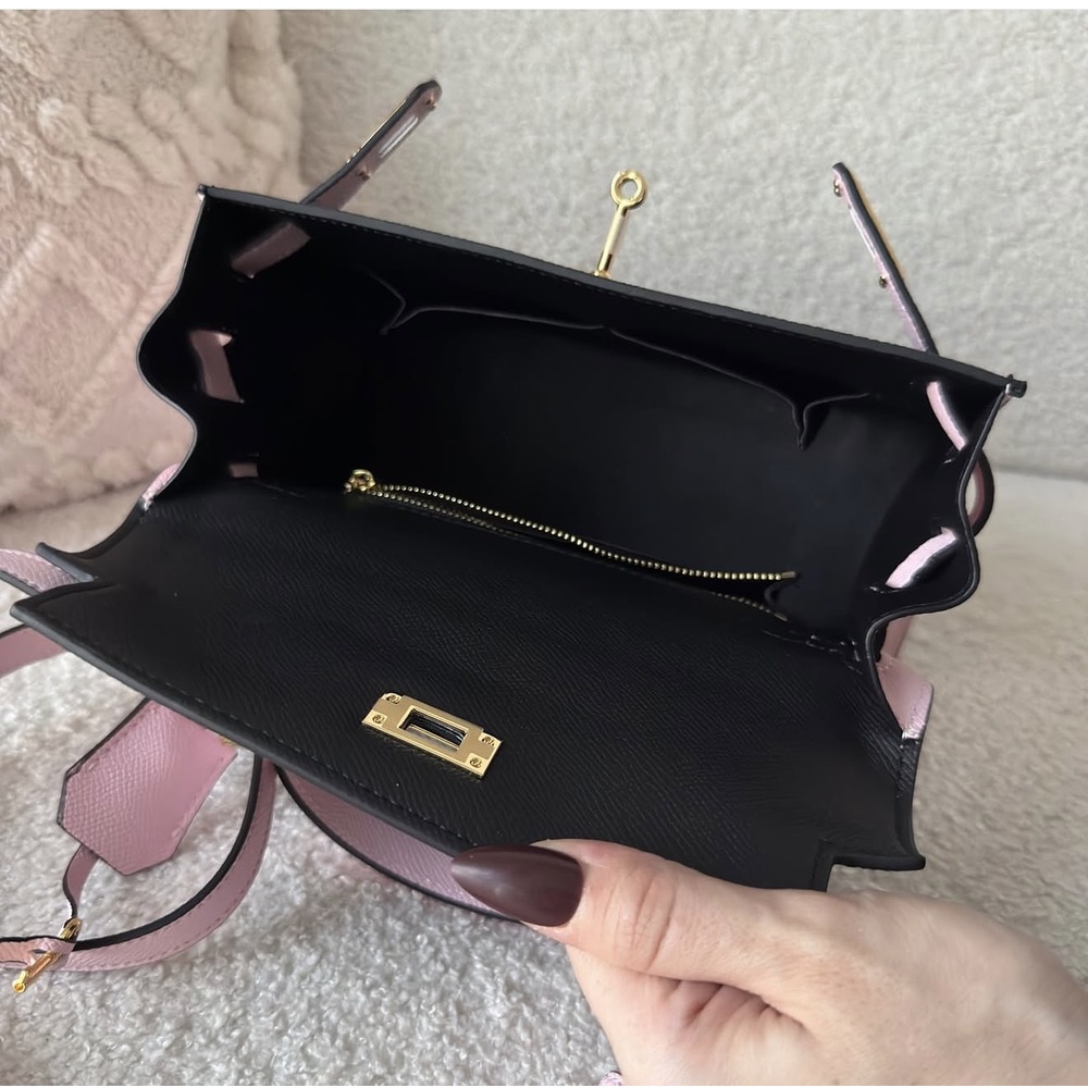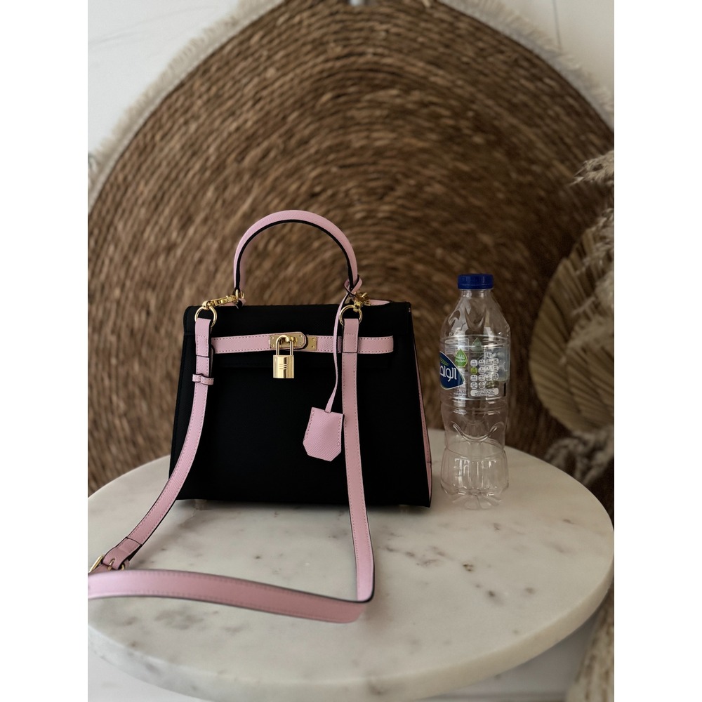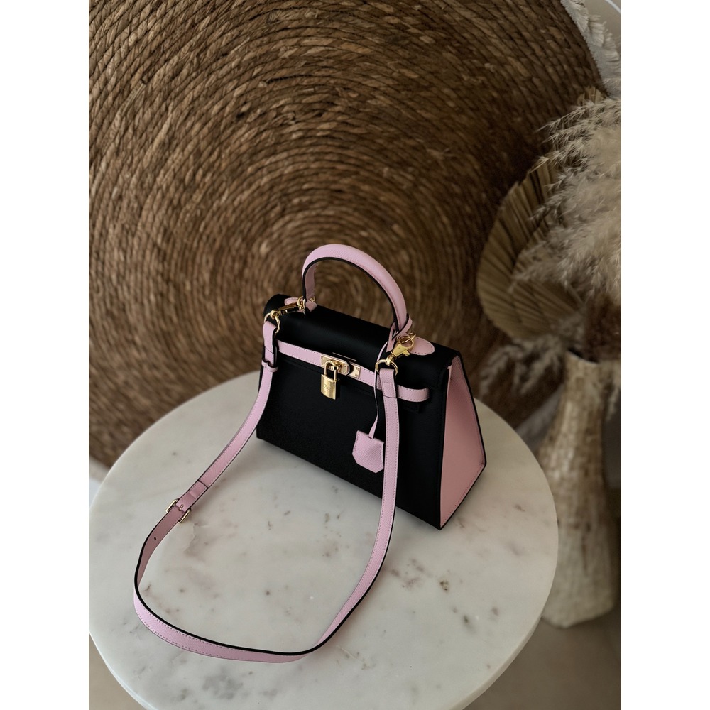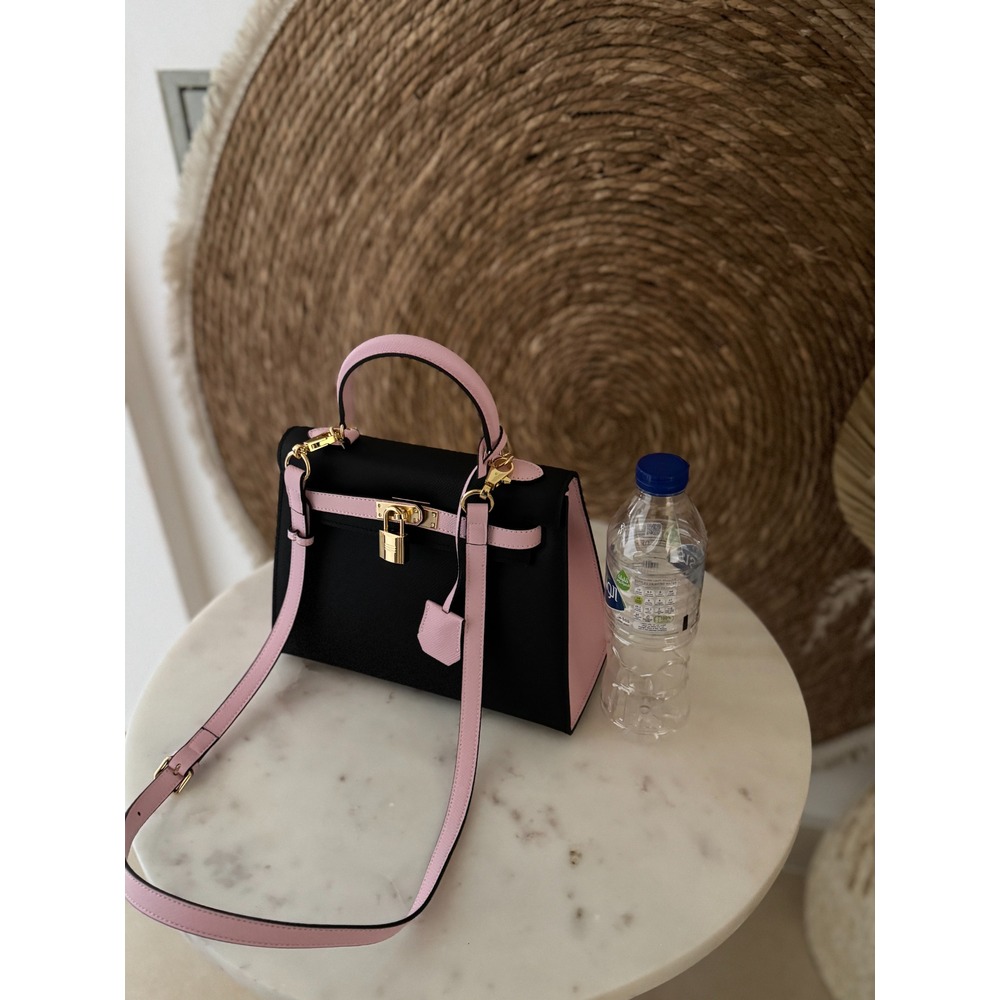 This Reem Store handbag is crafted from high-quality genuine leather with a refined, structured silhouette. The classic black body delivers timeless elegance, while the soft pink details add a unique feminine touch. It features a luxury gold lock closure for secure fastening and a premium look. Carry it by the top handle for a polished style, or attach the detachable long strap to wear it as a shoulder bag or crossbody. Medium-sized and neatly spacious inside—perfect for daily essentials without feeling bulky.