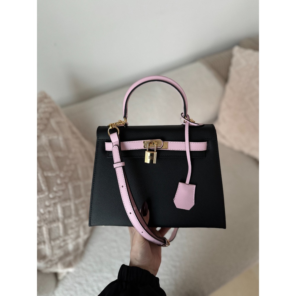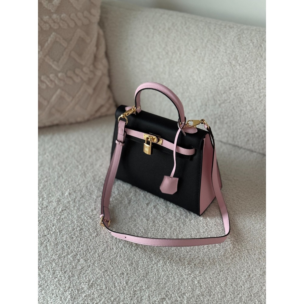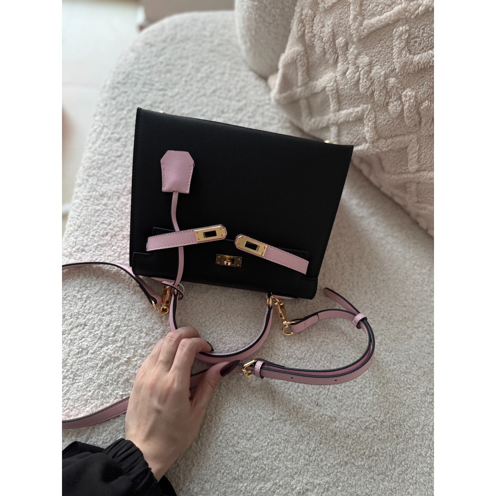 ✨A feminine luxury handbag that blends classic black with soft pink accents, featuring an elegant gold lock and versatile carrying options.