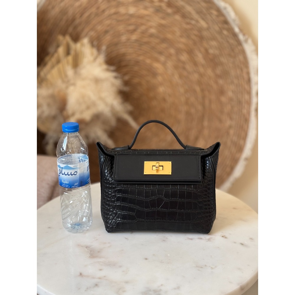 This Reem Store feminine handbag is made from high-quality genuine leather—soft, durable, and designed for daily elegance. It features a structured silhouette with a gold-tone lock closure for a luxurious look and secure fastening. The medium size is ideal for carrying essentials neatly while staying lightweight. What makes it truly unique is the smart back strap, designed to sit firmly and comfortably, adding a practical touch that stands out from typical handbags. Perfect for daily outings and light occasions, available in chic shades including black with a textured finish, taupe, and beige.