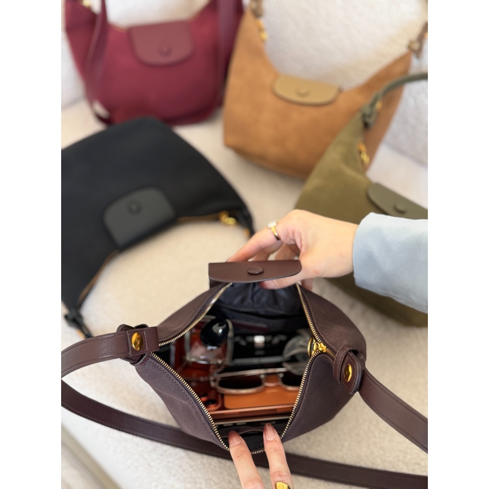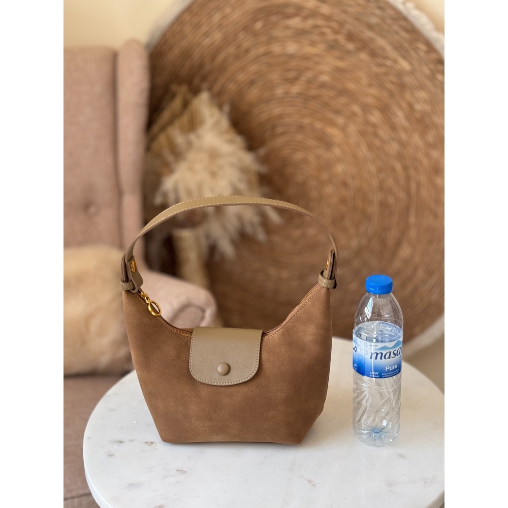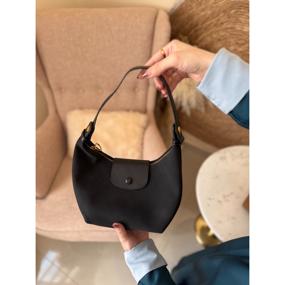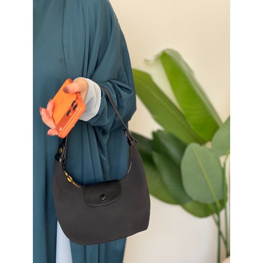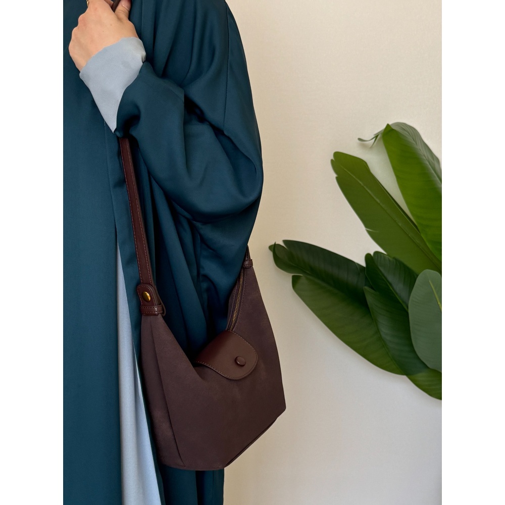 This Reem Store Suede Collection bag features a smooth suede-velvet finish with a chic curved silhouette. It includes a stylish front flap that snaps closed for a clean look, plus a center top zipper that adds security and makes organizing your items effortless. The interior size is practical for daily essentials like a phone, wallet, small perfume, and sunglasses (as shown in the photos). Finished with a long adjustable strap, it can be worn as a shoulder or crossbody bag. Available in elegant shades like burgundy, beige, green, and black.