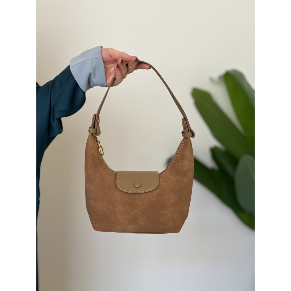 Lightweight suede everyday bag with a front snap flap, secure top zipper, and an adjustable strap for shoulder or crossbody wear.