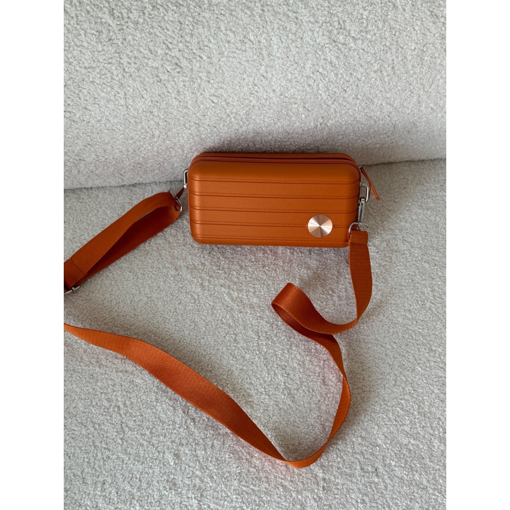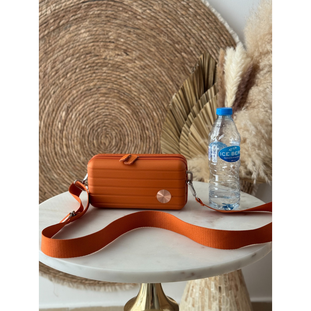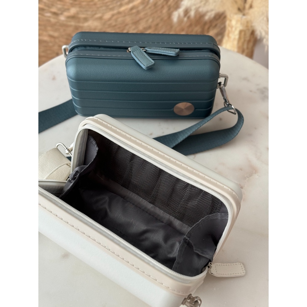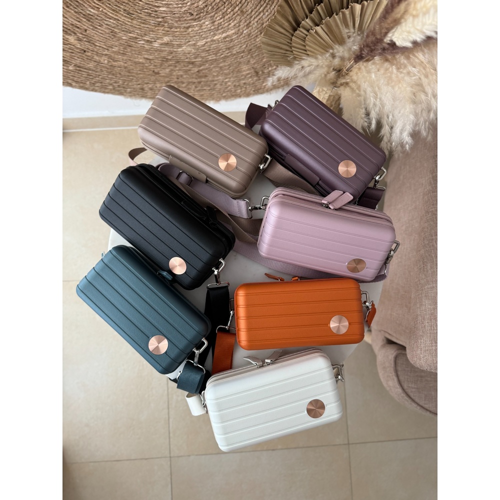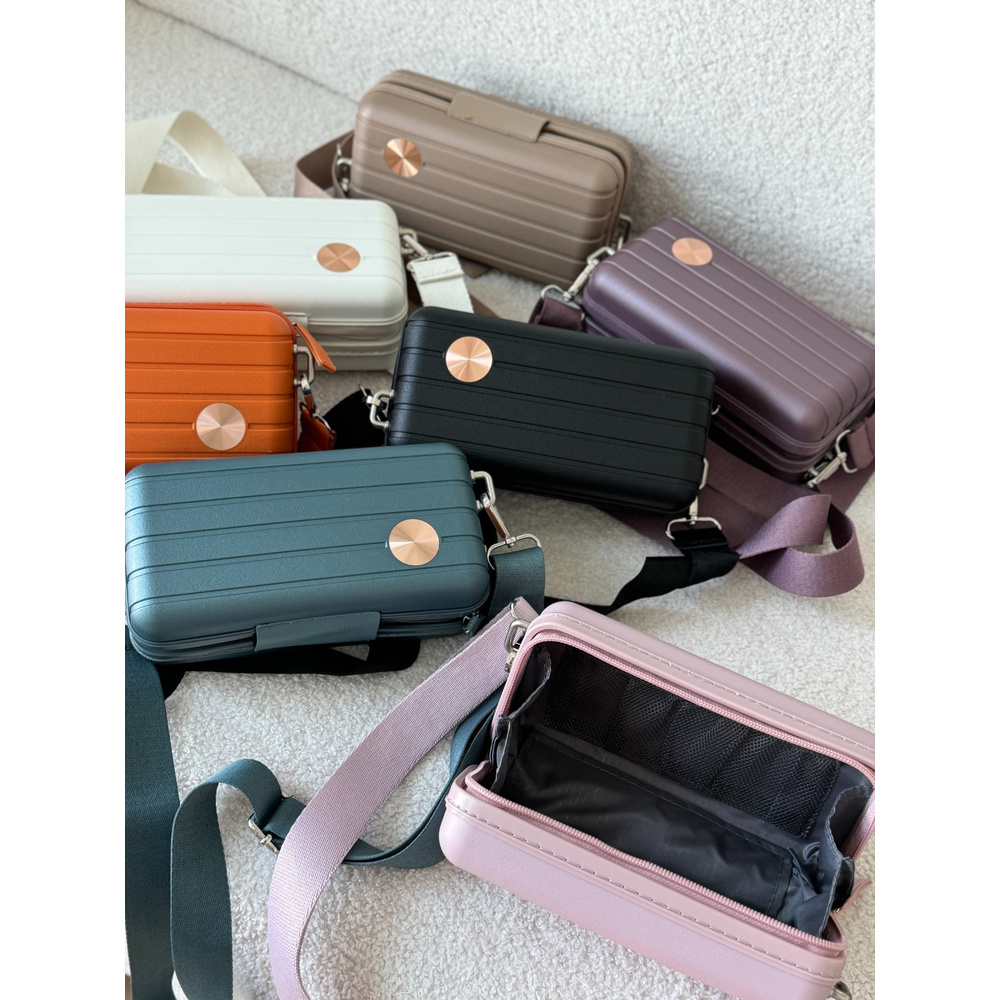 Travel-inspired mini suitcase crossbody with a structured hard case, wide adjustable strap, and organized interior for your daily essentials.