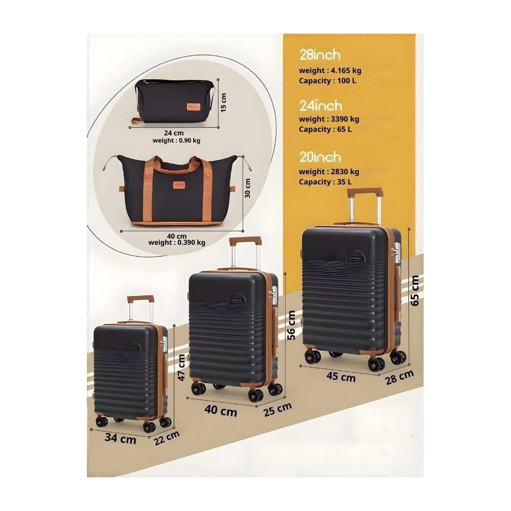 طقم 2026 يتكون من 3 شنط سفر (28/24/20 إنش) مع هاند باق للوزن الزائد/اليد وشنطة ميكاب للأغراض المهمة. خامة الشنط ABS قوية وخفيفة مع قفل وعجلات 360° دوران سلس. من الداخل مقسمة ومفصولة من الجهتين لتنظيم أفضل.بمتناول اليد
