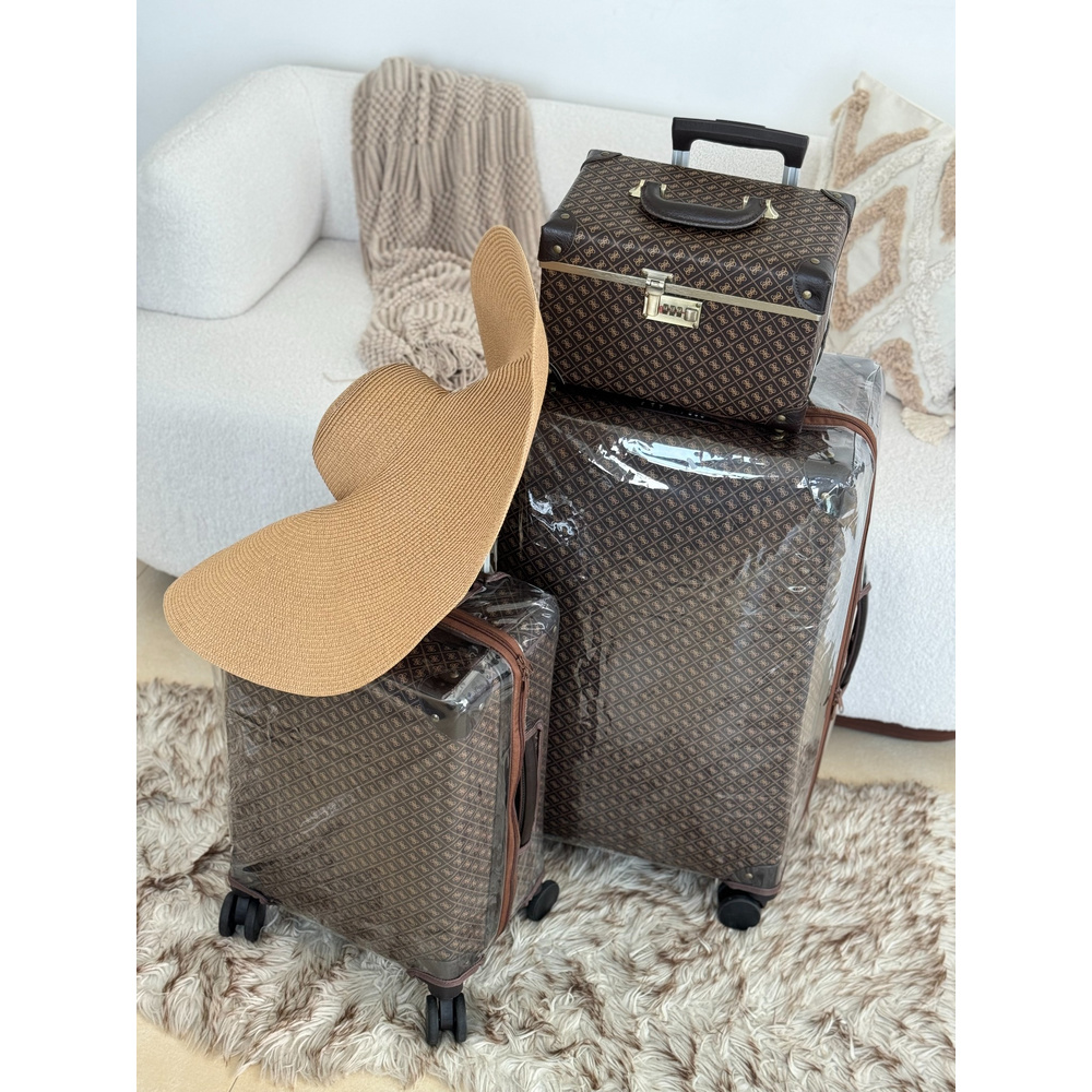 طقم الحقائب الجلدي الحصري من متجر ريم مكوّن من 3 قطع، مصنوع من جلد بني فاخر بنقشة عتيقة. يشمل ثلاث مقاسات متعددة الاستخدام: 28″ – 20″ – 14″. الحقيبة الصغيرة "حقيبة الكنز" (تاجوري) يمكن تثبيتها على الحقيبة الكبيرة أو حملها على الكتف، ما يجعلها مثالية للأغراض الثمينة. مع حجرات داخلية ذكية وأغطية واقية شفافة، يجمع هذا الطقم بين الفخامة، العملية، والحصرية.
