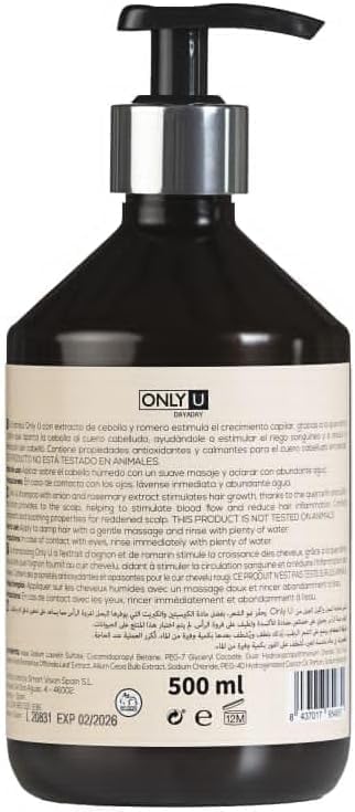 اونلي يو شامبو بخلاصة البصل وإكليل الجبل – 500 مل هو منظف للشعر منشط يهدف إلى تحفيز صحة فروة الرأس وتعزيز قوة وكثافة الشعر. يحتوي على خلاصة البصل القوية وخلاصة إكليل الجبل، حيث يغذي بصيلات الشعر، ويحسن الدورة الدموية في فروة الرأس، ويساعد على تقليل تساقط الشعر مع تعزيز اللمعان والحيوية. مستخلص البصليوفر الكيرسيتين والكبريت — وهما مضادان قويان للأكسدة يعملان على محاربة الجذور الحرة وحماية الشعر من الأضرار البيئية. كما تساعد هذه العناصر الغذائية في تقليل التهاب فروة الرأس وتحفيز الدورة الدموية الصحية في بصيلات الشعر، مما يدعم نموًا أفضل وحيوية محسنة.