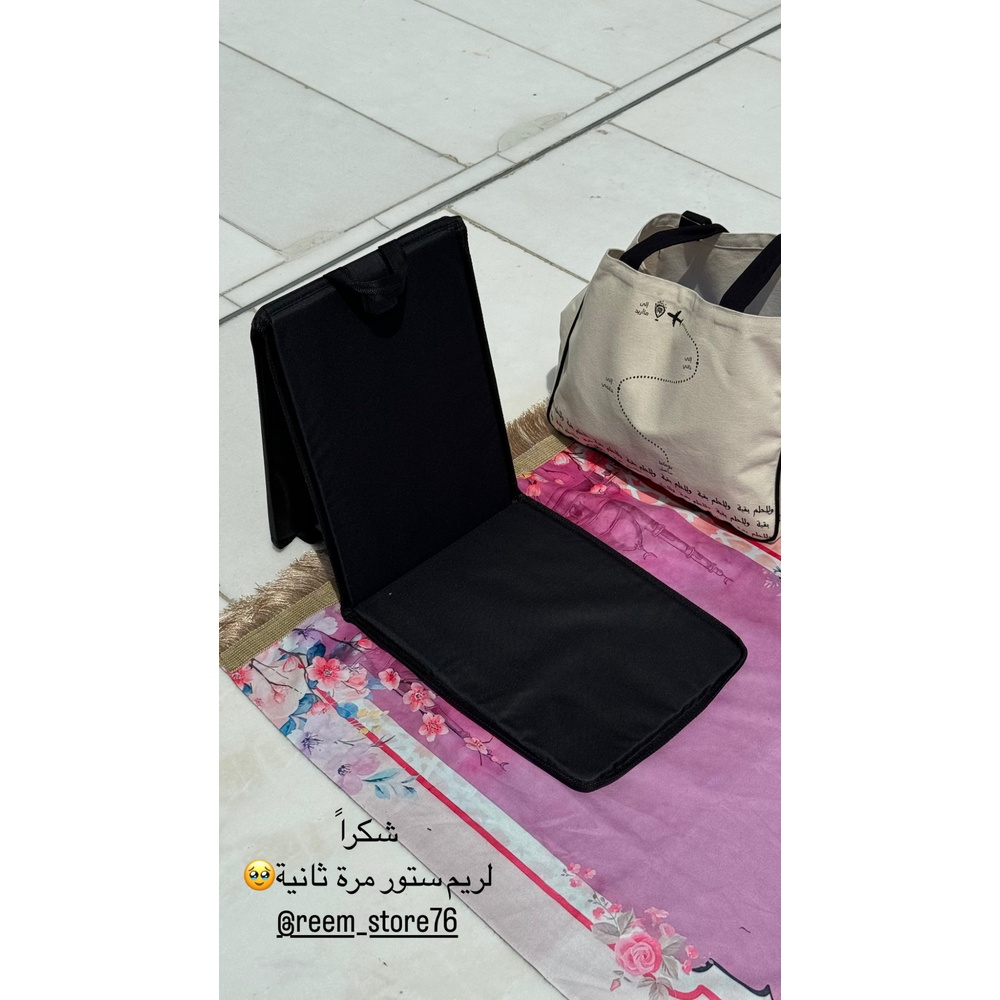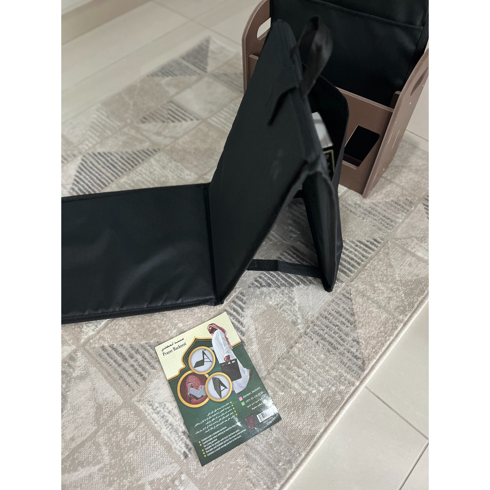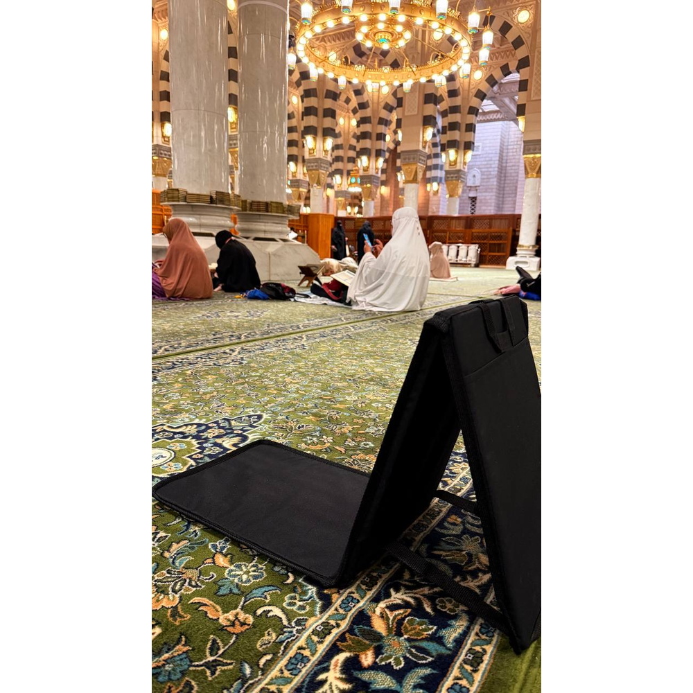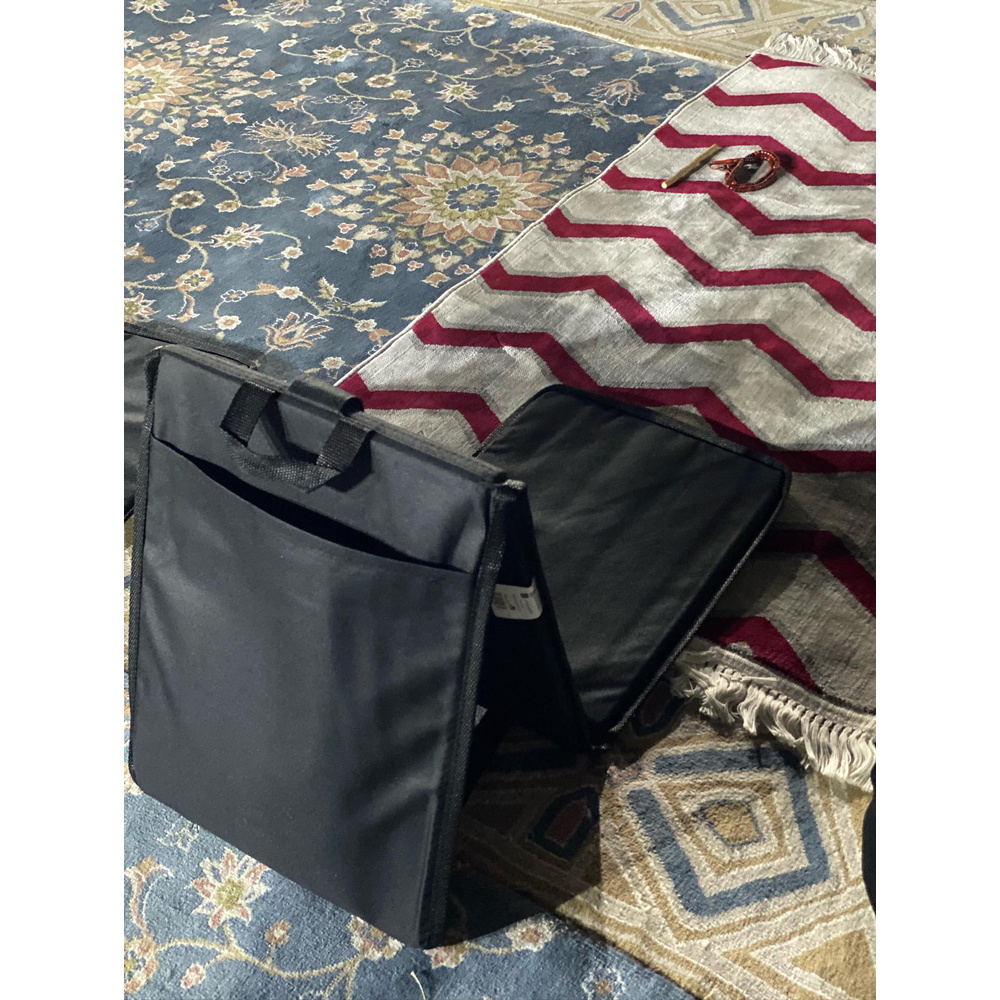 مسند مبطن وقابل للطي مصمم لتوفير الراحة أثناء الجلوس لفترات طويلة أثناء قراءة القرآن الكريم والذكر. مثالي لمن يعانون من آلام الظهر أو الركبتين. مدمج، قابل للطي، وسهل الحمل للسفر والنزهات. يشمل جيبًا صغيرًا في الخلف لتخزين الأغراض الشخصية.