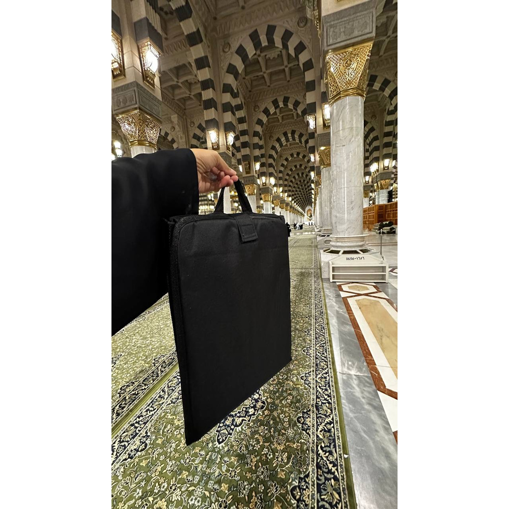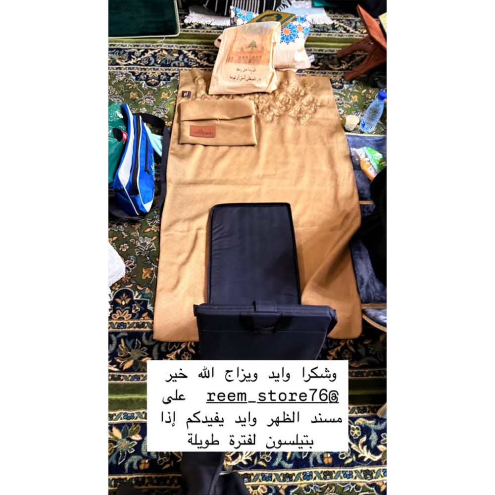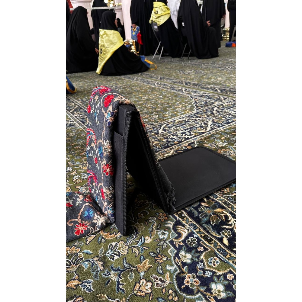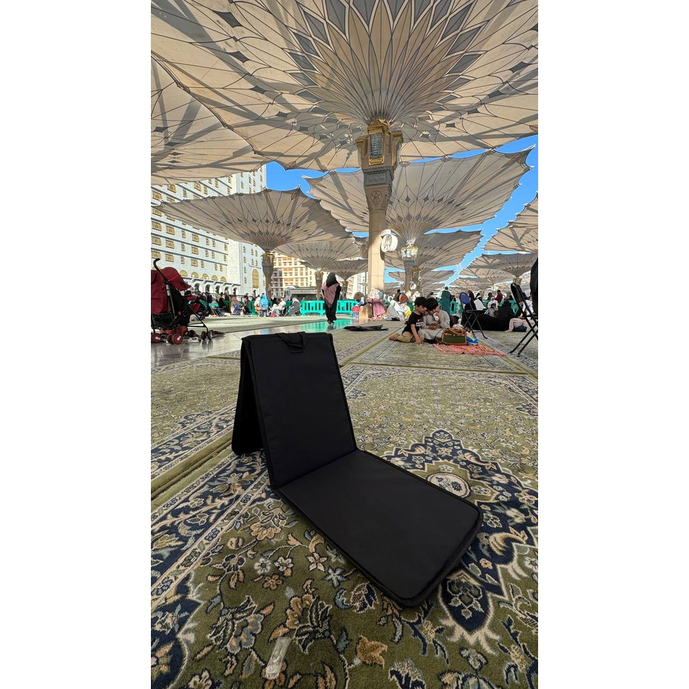 مسند مبطن وقابل للطي مصمم لتوفير الراحة أثناء الجلوس لفترات طويلة أثناء قراءة القرآن الكريم والذكر. مثالي لمن يعانون من آلام الظهر أو الركبتين. مدمج، قابل للطي، وسهل الحمل للسفر والنزهات. يشمل جيبًا صغيرًا في الخلف لتخزين الأغراض الشخصية.