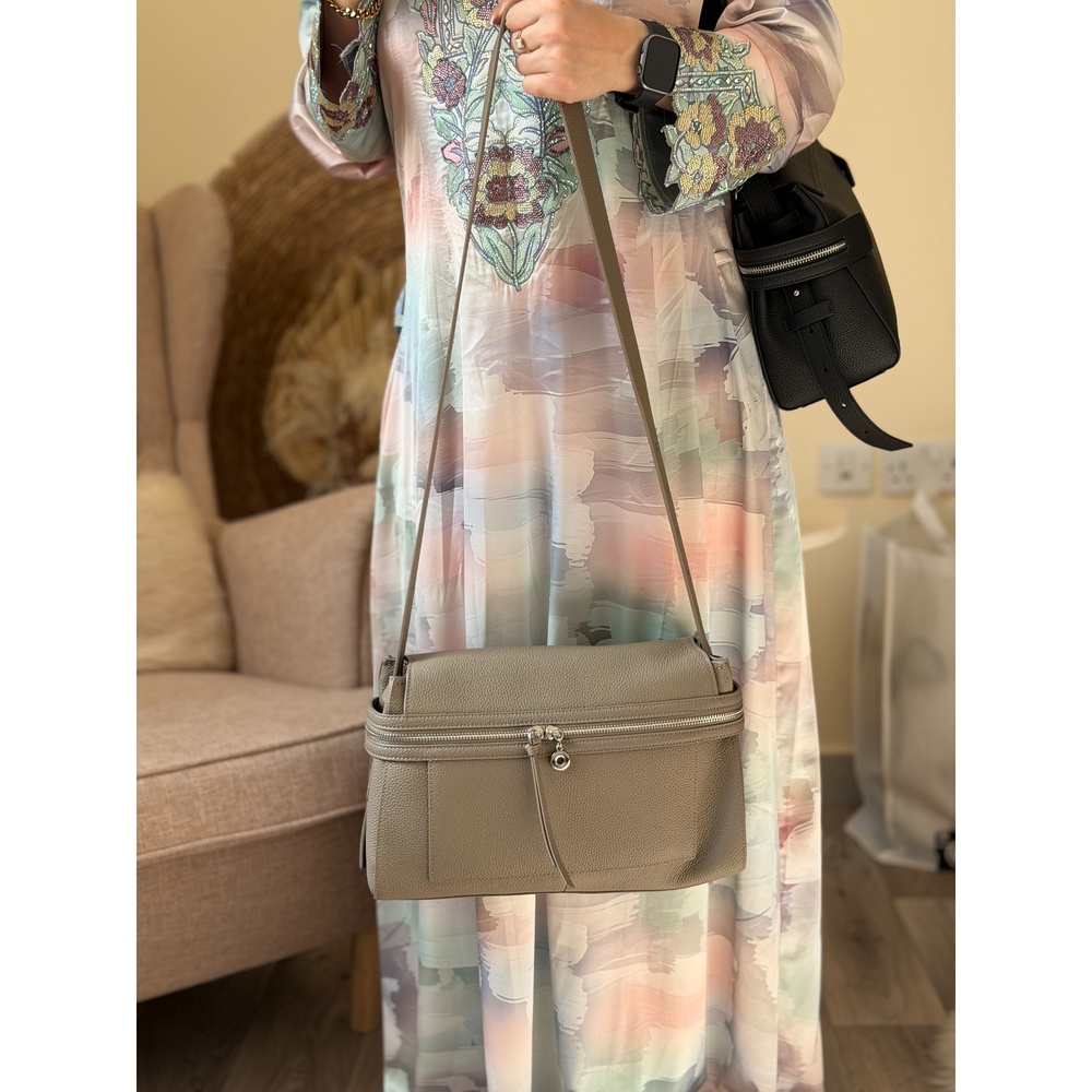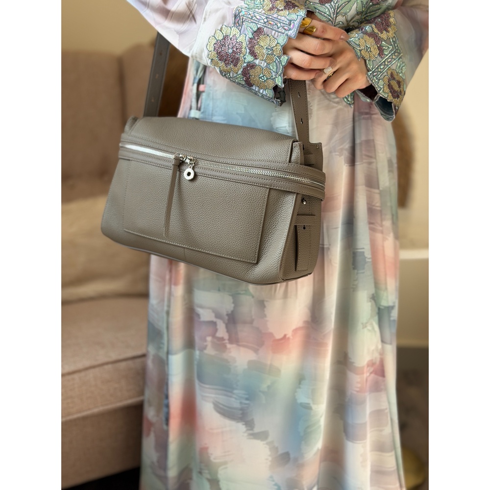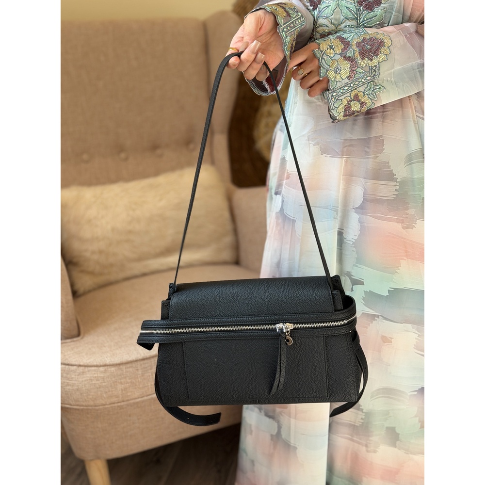 This Reem Store handbag is crafted from genuine leather with a soft premium texture and a refined minimalist silhouette. Its large roomy size makes it ideal for everyday use, while the neatly divided interior helps organize your essentials with ease. The wide comfortable strap sits securely on the shoulder, and the top zip closure keeps everything protected. With its calm neutral shades and clean structure, it pairs effortlessly with daily looks, abayas, and smart casual outfits.